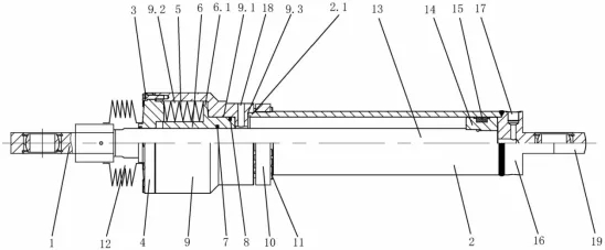 涉案专利权利要求1涉及一种液压油缸,包括第一缸筒、第二缸筒、第一活塞、第二活塞、缸尾和活塞杆,第一缸筒的一端与缸尾连接,第一缸筒的另一端与第二缸筒连接,第二缸筒远离第一缸筒的一端设置有压盖,活塞杆穿过压盖位于第一缸筒与第二缸筒内,第一活塞位于第一缸筒内,第一活塞与活塞杆一端固定连接,第二活塞位于第二缸筒内,第二活塞与活塞杆滑动连接;第二活塞与压盖之间设置有压缩弹性件;缸尾上设置有第一油口,第二缸筒上设置有第二油口,第二油口位于第一活塞与第二活塞之间。涉案专利提供的液压油缸如下图所示: